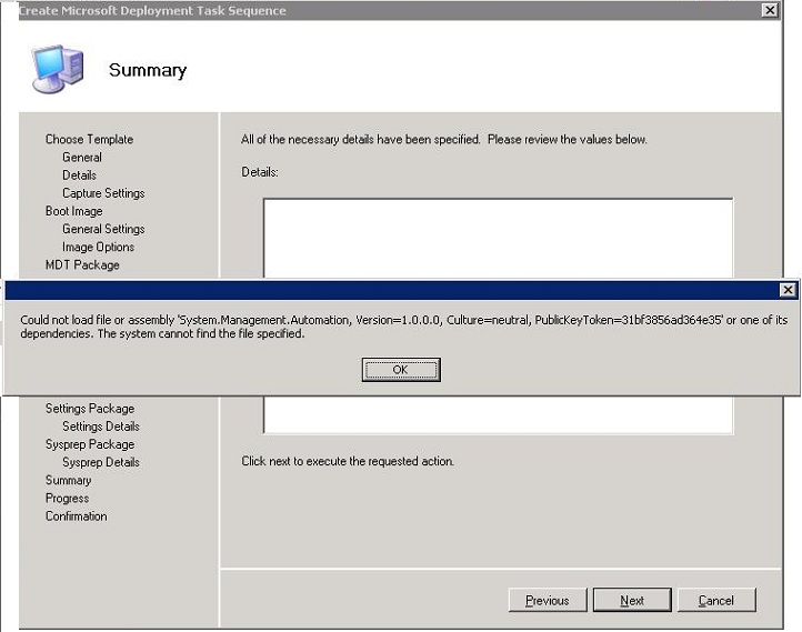 You are using Microsoft System Center Configuration Manager – Operating System Deployment to deplou Microsoft Windows 7, and you receive the following error message during creating of task sequence:
