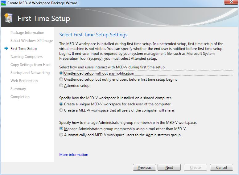 5- On the First Time Setup page, select whether you want first time setup to run while attended or unattended and whether you want the MED-V workspace used separately or used by all end users on a shared computer.