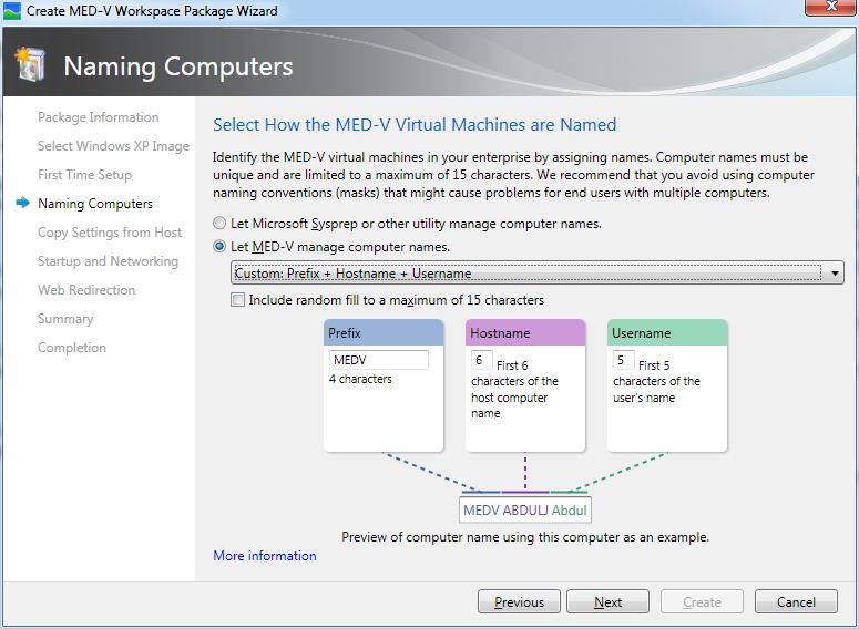 If you specify that computer naming is managed by MED-V, select a predefined computer naming convention (mask) from the drop-down list. A preview of a sample computer name appears that is based on the computer that you are using to build the MED-V workspace package.