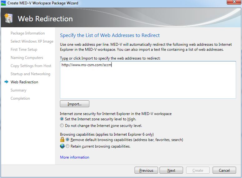 9- On the Web Redirection page, you can enter, paste, or import a list of the URLs that are redirected to Internet Explorer in the MED-V workspace.