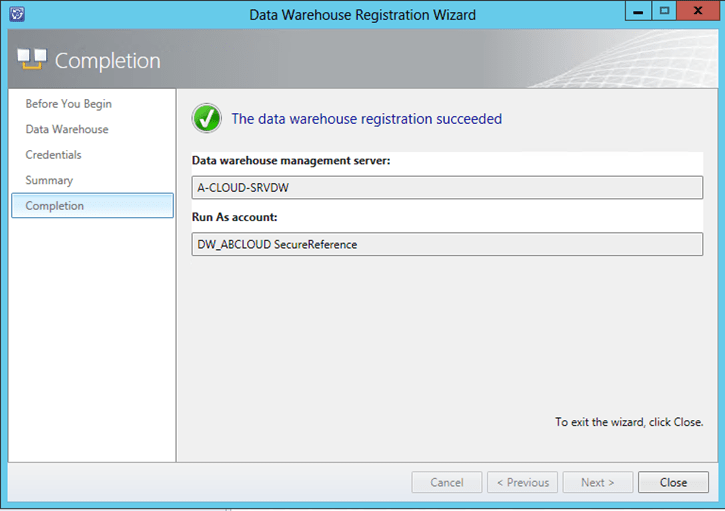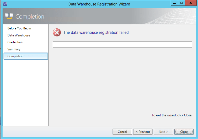 When we run the Data Warehouse Registration Wizard to registers the service manager management group with the data warehouse management group and to deploy management packs from the service manager management server to the data warehouse management server, we received the following error in the completion step: