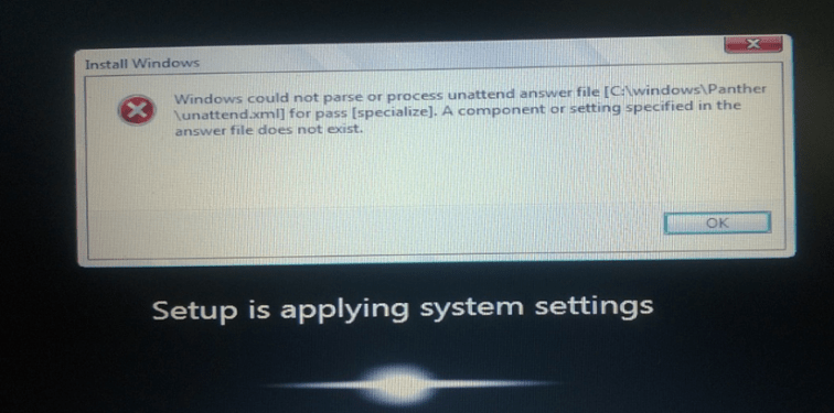 Windows could not parse or process unattend answer file [C:windowsPantherunattend.xml] for pass [specialize]. A component or setting specified in the answer file does not exist.